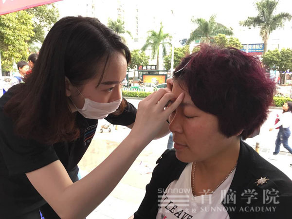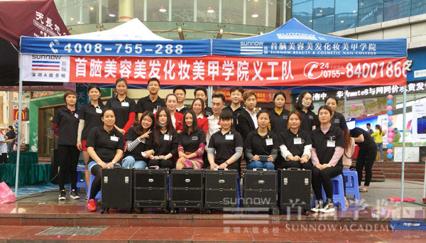 3月19日下午,龙岗校区化妆班、美容班、美甲班和美发班再次与大家相约志健时代广场,同时,美发老师董萱霈带领另一队义工来到了华强北红荔村,将义工行动进行到底,传播首脑向上、向前、向善的大爱精神。在两个义工场地,前来化妆、美甲、理发的顾客络绎不绝,学员们专业的技术和认真的态度赢得了在场顾客的声声赞扬!